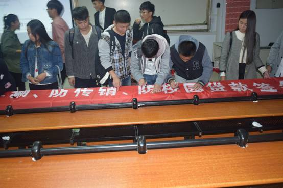 通过开展主题班会,使得同学们了解了网络诈骗的常见手段,一些同学结合自身所见所闻向同学们讲述传销危害,提醒同学们要提高警惕,识别骗局。主题座谈会过程中,各班及学生会代表在心理咨询室进行了一场“防诈骗,防传销”小测试。测试内容包括对传销的认识、遇到诈骗行为或传销行为时应该怎么做、如何帮助身边的同学远离诈骗及传销行为这几个方面。在本次座谈会中学生们学会了如何预防诈骗与传销。签名仪式中,全体大一成员在赵许培老师的带领下在“远离诈骗,远离传销”的横幅上签下了自己的名字。