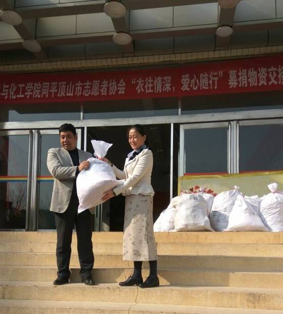 下午两点活动正式开始。活动过程中,数理学院社会服务部将在学院内募捐到的爱心物资如数交给平顶山志愿者协会,数理学院青年志愿者们希望能通过平顶山志愿者协会将我们的爱心带到需要的人手中,希望能给他们提供帮助,给他们带去温暖。之后,平顶山志愿者协会向同学们表达了感谢,表示一定将这些物资送到需要的人手中,充分的发挥他们的作用。活动结束后,志愿者们一起合影留念,本次活动圆满结束。