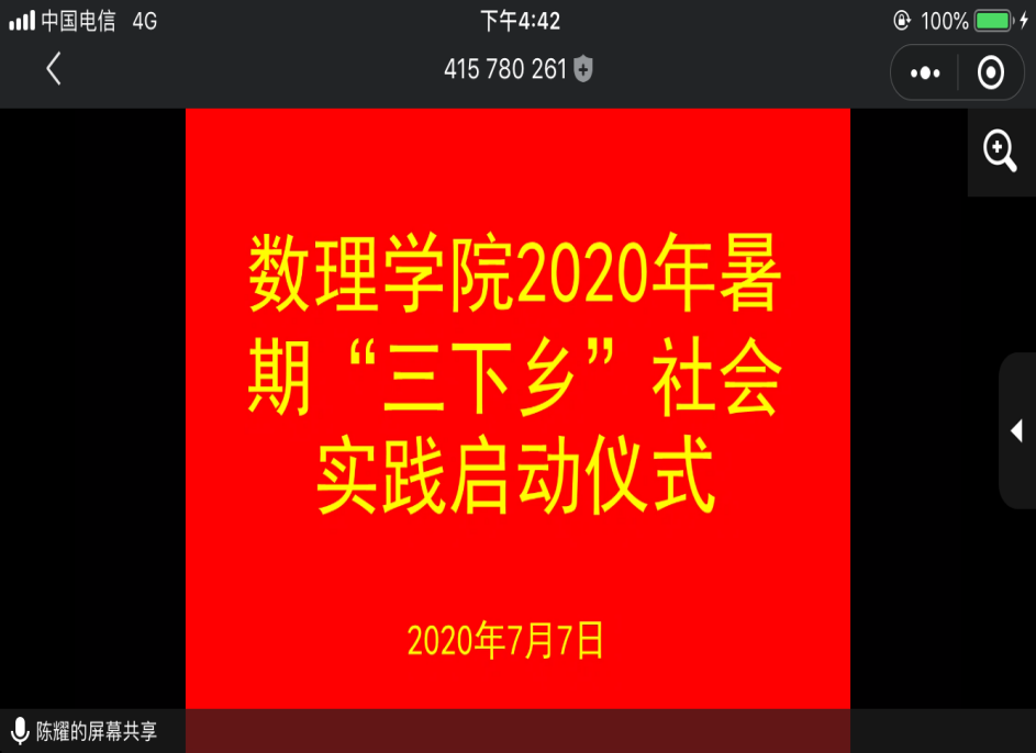 (通讯员:张小牧 曹敏)为深入学习贯彻习近平新时代中国特色社会主义思想,组织引导广大青年学生扎根中国大地了解国情民情, 增强“四个意识”、坚定“四个自信”、做到“两个维护”,积极响应习近平总书记对全国各族青年的寄语精神,以实际行动建设祖国服务人民,响应校团委号召,数理学院积极开展2020年暑期“三下乡”社会实践活动,并于7月7日以线上会议的方式举行2020年大学生暑期“三下乡”社会实践活动启动仪式。数理学院党总支书记刘雅妹主持本次会议,院长徐华锋、副书记周树克出席本次会议,团总支书记李亚林、各三下乡团队指导老师及全体三下乡成员参加本次会议。
