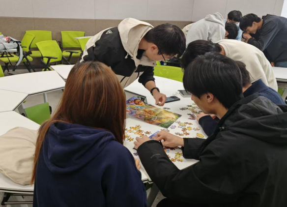 “心灵拼图”疗愈工坊则以协作互动为核心,青马班同学分组参与知识抢答与拼图挑战,在分工合作中驱散焦虑、建立自信,收获“被需要”的价值感与集体成就感,有效疏解了学业竞争与使命担当带来的隐性压力。