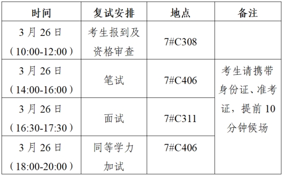 复试内容包括思想政治素质和品德考核、专业课测试、面试、同等学力加试(加试方式为笔试)等。
